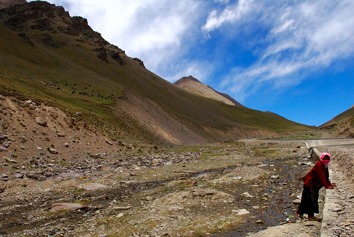青藏高原的原住民。远远的,他们的牛羊在山坡上吃草,而主人则可以悠闲地在路边看风景。