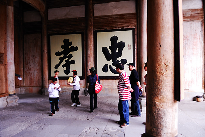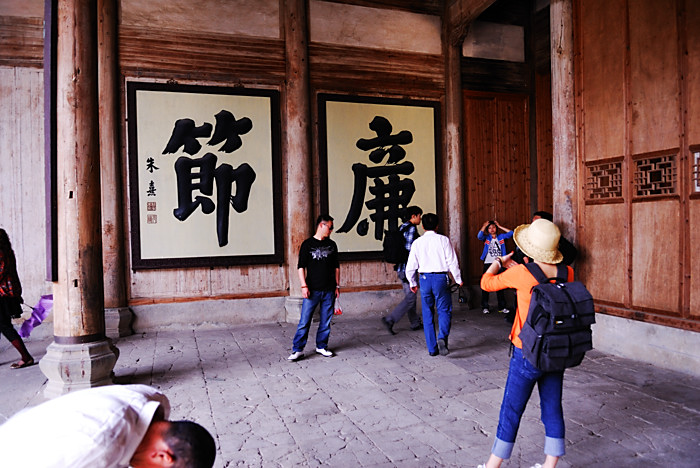 进来后,“忠孝廉节”四个斗大的字映入眼帘。此乃朱熹所题,铁划银钩,雄壮有力。
